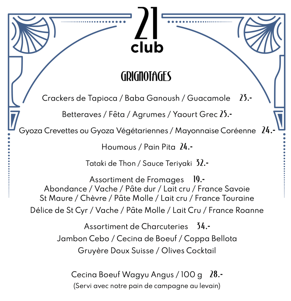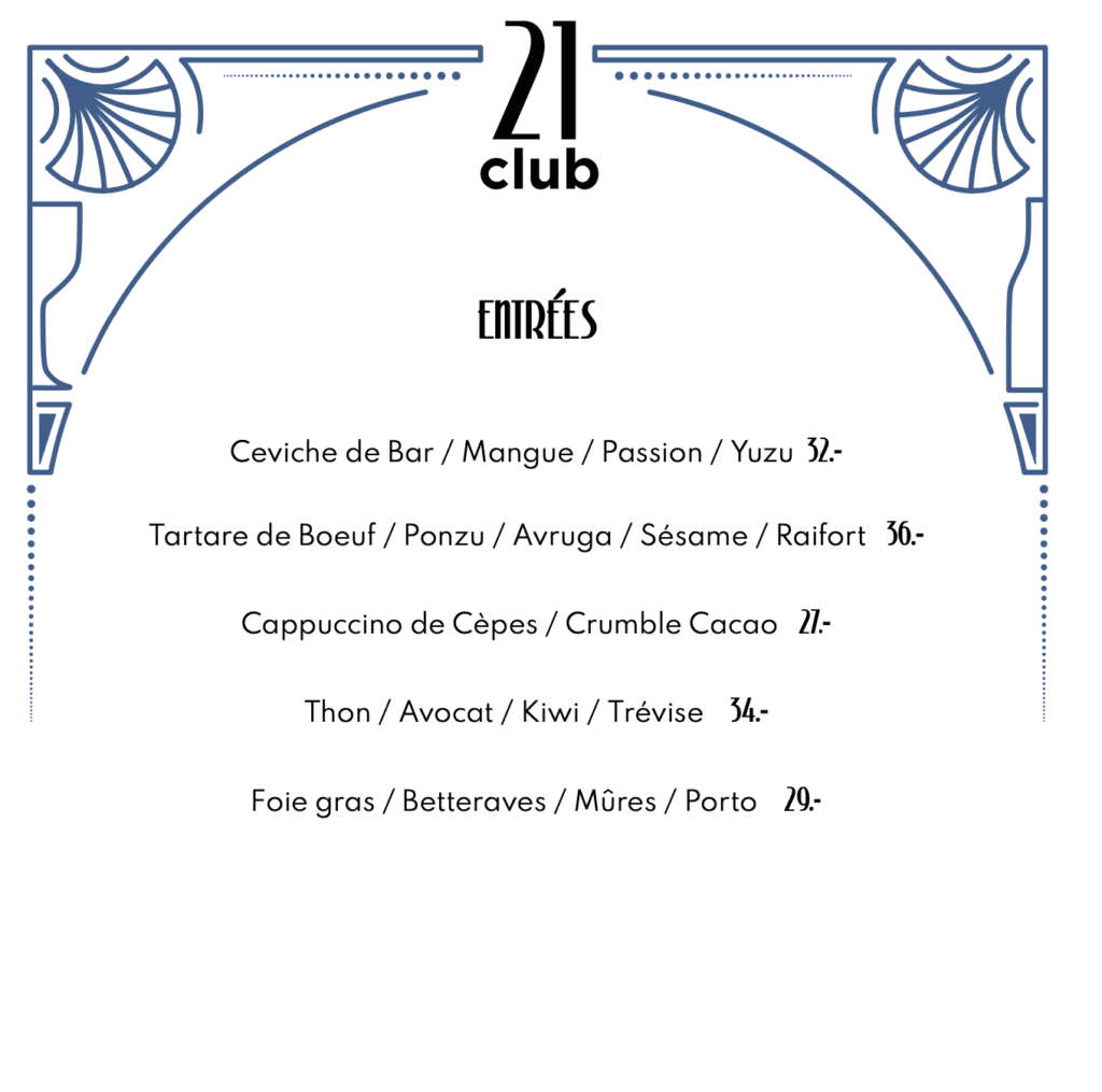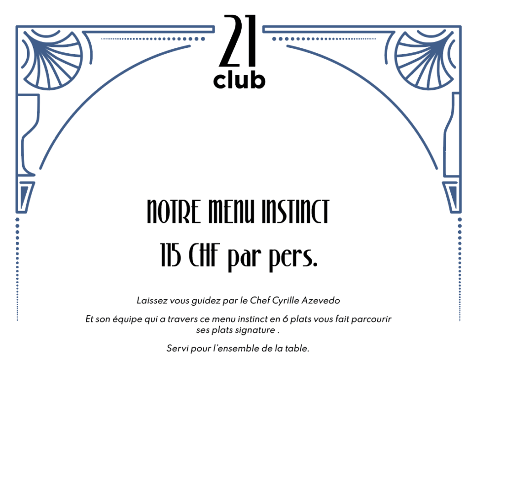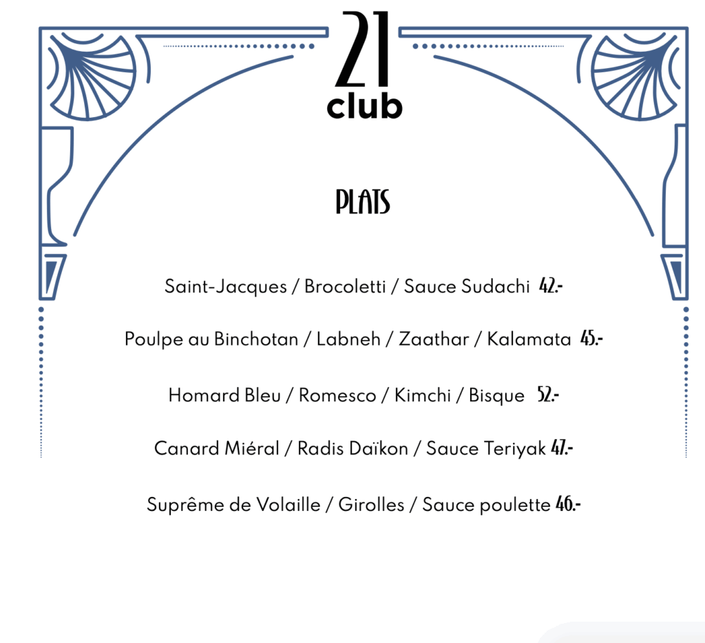 Check Out notre menu à la carte Menu menus dégustation Our chef specials menu Discover our menu english menu cocktails Our bartender selection Cliquez ici Instagram Tiktok Liens rapides Accueil Réservation Privatisation Histoire Food Cocktails Vin Contact Accueil Réservation Privatisation Histoire Food Cocktails Vin Contact Instagram Tiktok Informations Rue Henri Blanvalet, 1207 GE contact@21club.ch + 41(0) 79 948 52 48 MARDI-MERCREDI: 17.30-01:00 JEUDI: 17.30-02:00 VENDREDI-SAMEDI: 17.30-04:00 DIMANCHE-LUNDI: FERME