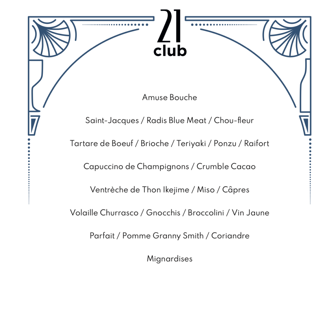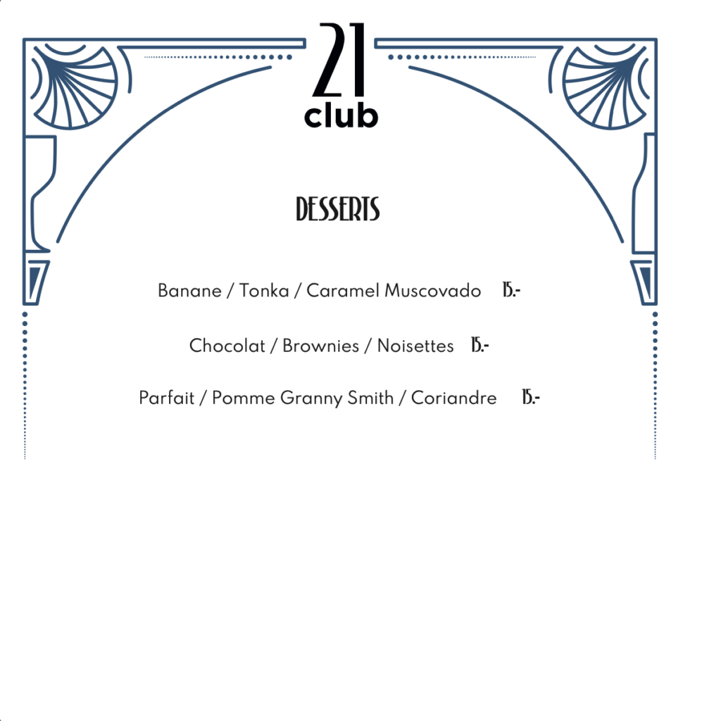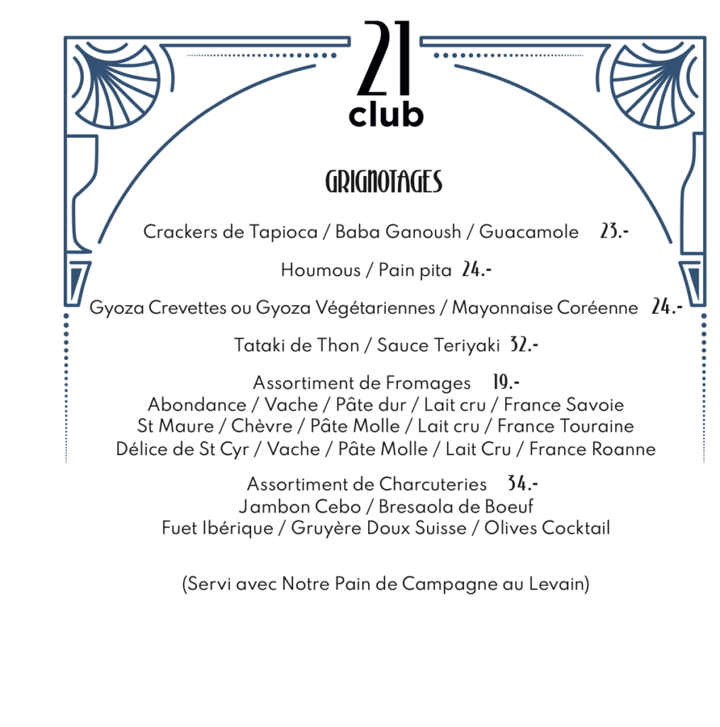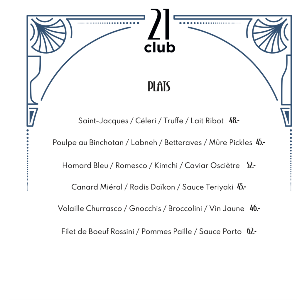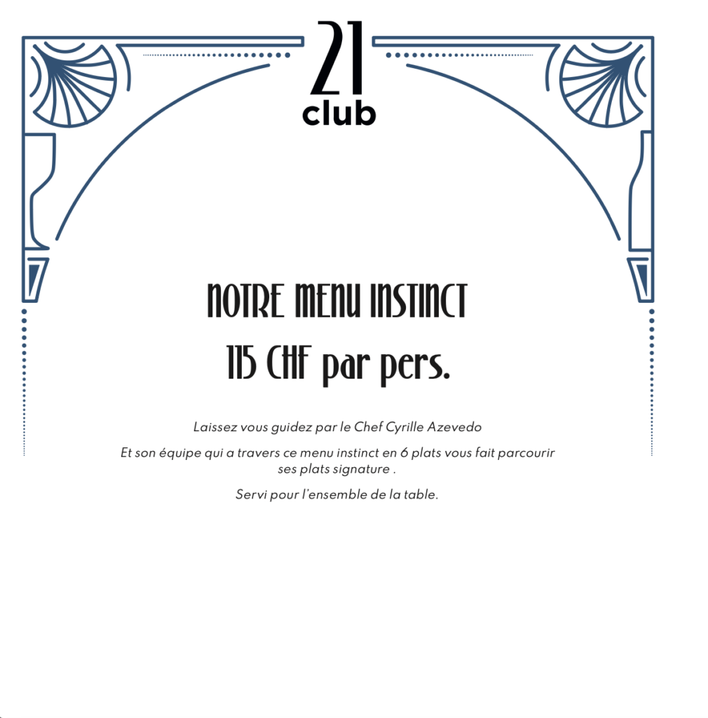 Check Out notre menu à la carte Menu menus dégustation Our chef specials menu menus instinct Our chef specials menu Discover our menu english menu cocktails Our bartender selection Cliquez ici Instagram Tiktok Liens rapides Accueil Réservation Privatisation Histoire Food Cocktails Vin Contact Accueil Réservation Privatisation Histoire Food Cocktails Vin Contact Instagram Tiktok Informations Rue Henri Blanvalet, 1207 GE contact@21club.ch + 41(0) 79 948 52 48 MARDI-MERCREDI: 17.30-01:00 JEUDI: 17.30-02:00 VENDREDI-SAMEDI: 17.30-04:00 DIMANCHE-LUNDI: FERME